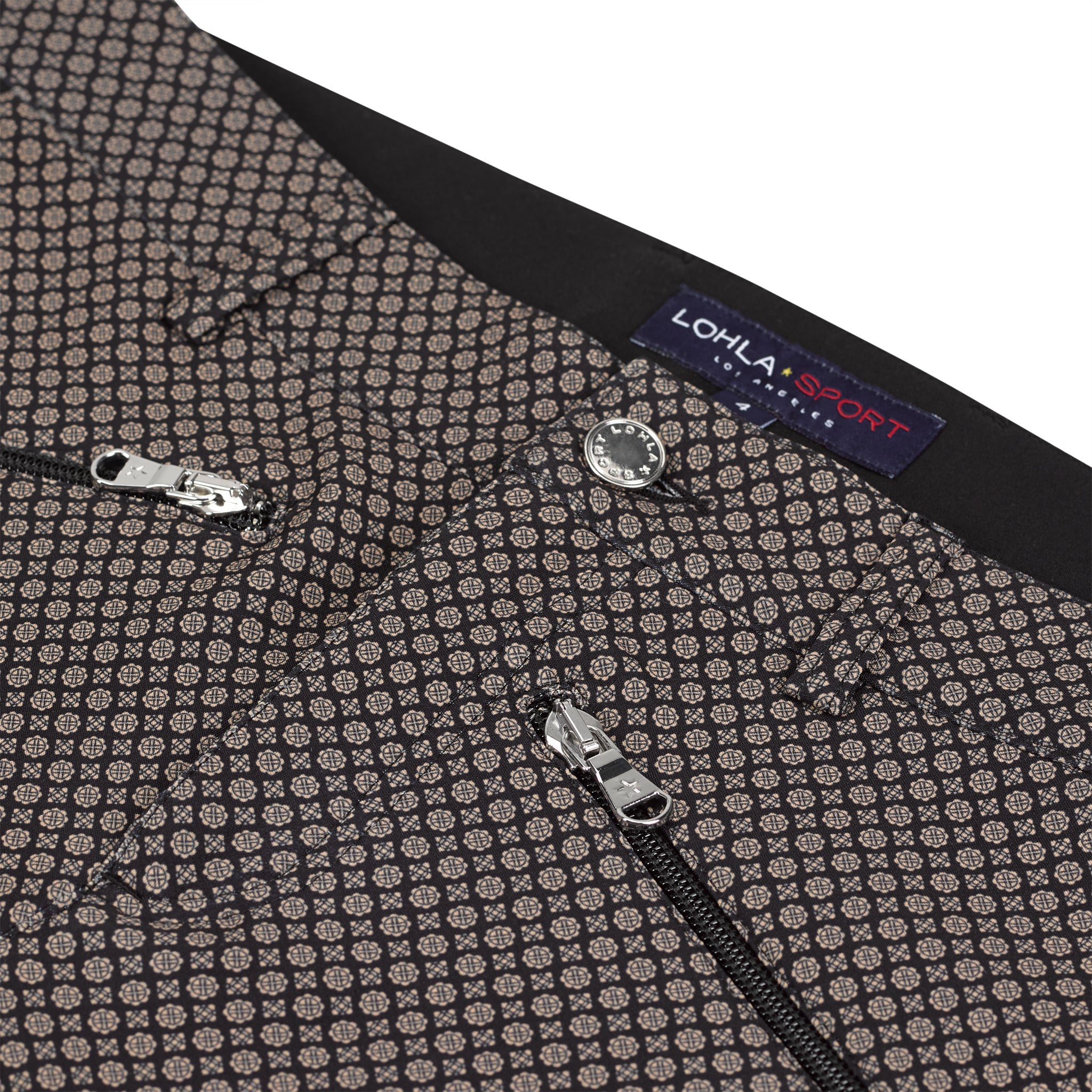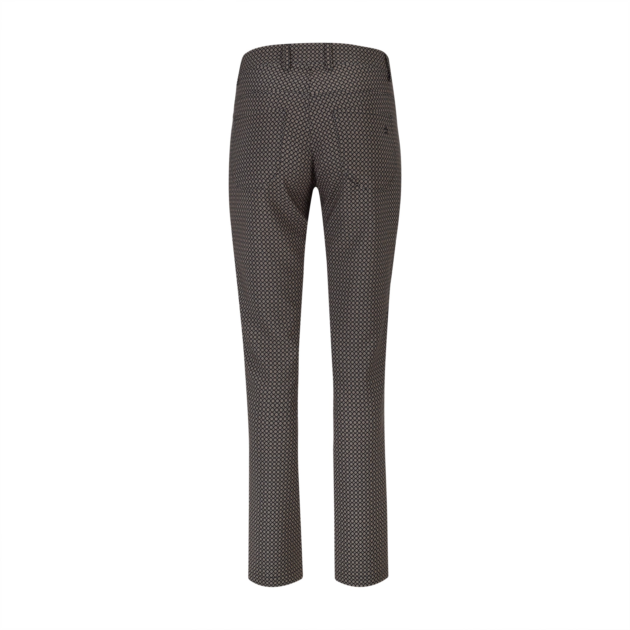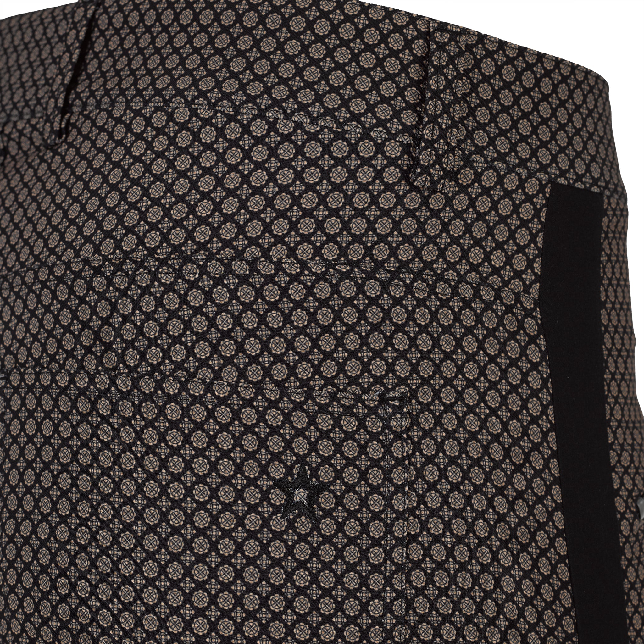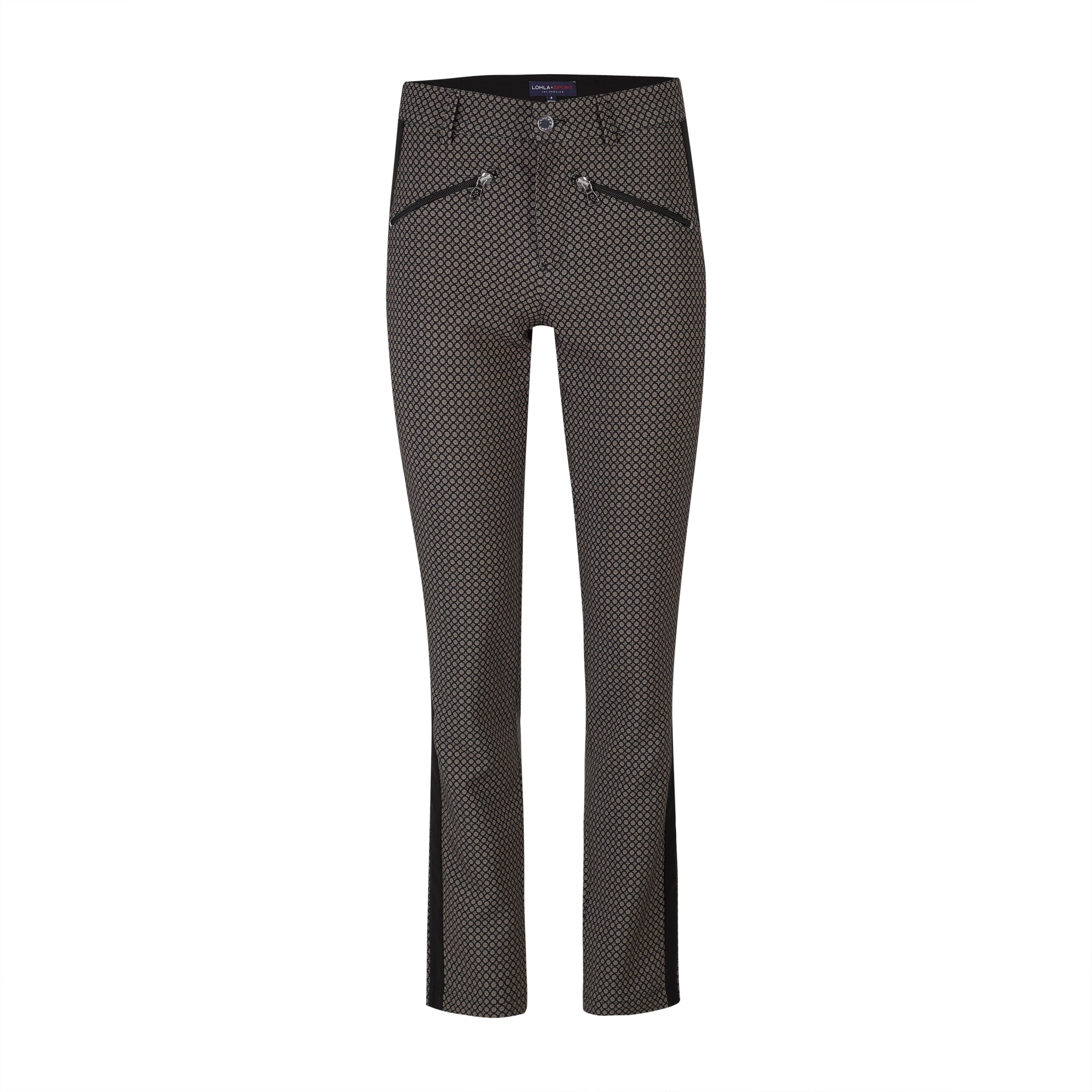 Black and khaki Alpine jacquard printed pants. Ankle pant length. Black tuxedo stripe down side. Two front slant zip pockets. Two back patch pockets. Matches all tops in the Mont Blanc Collection. Wash in cold. Hang to dry.