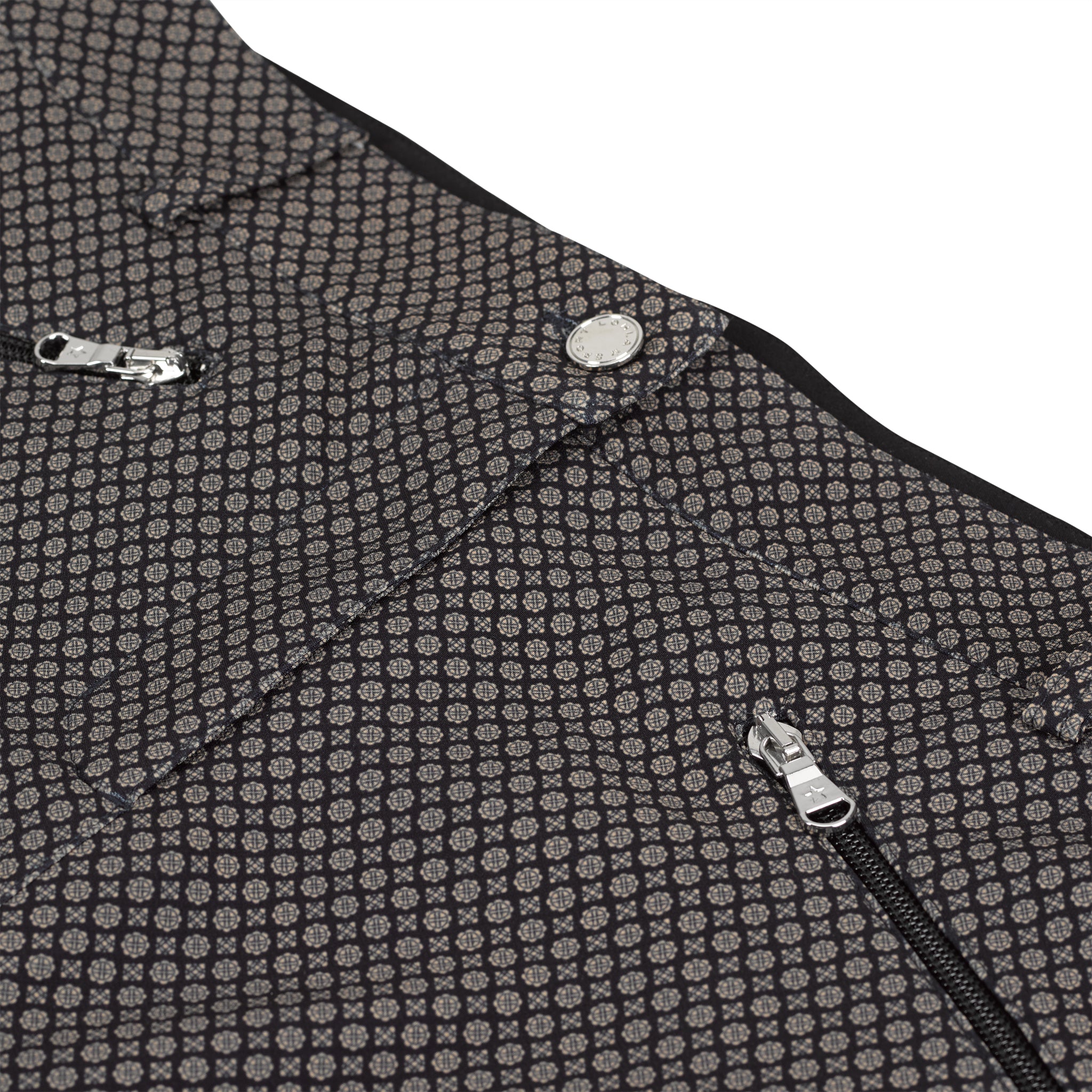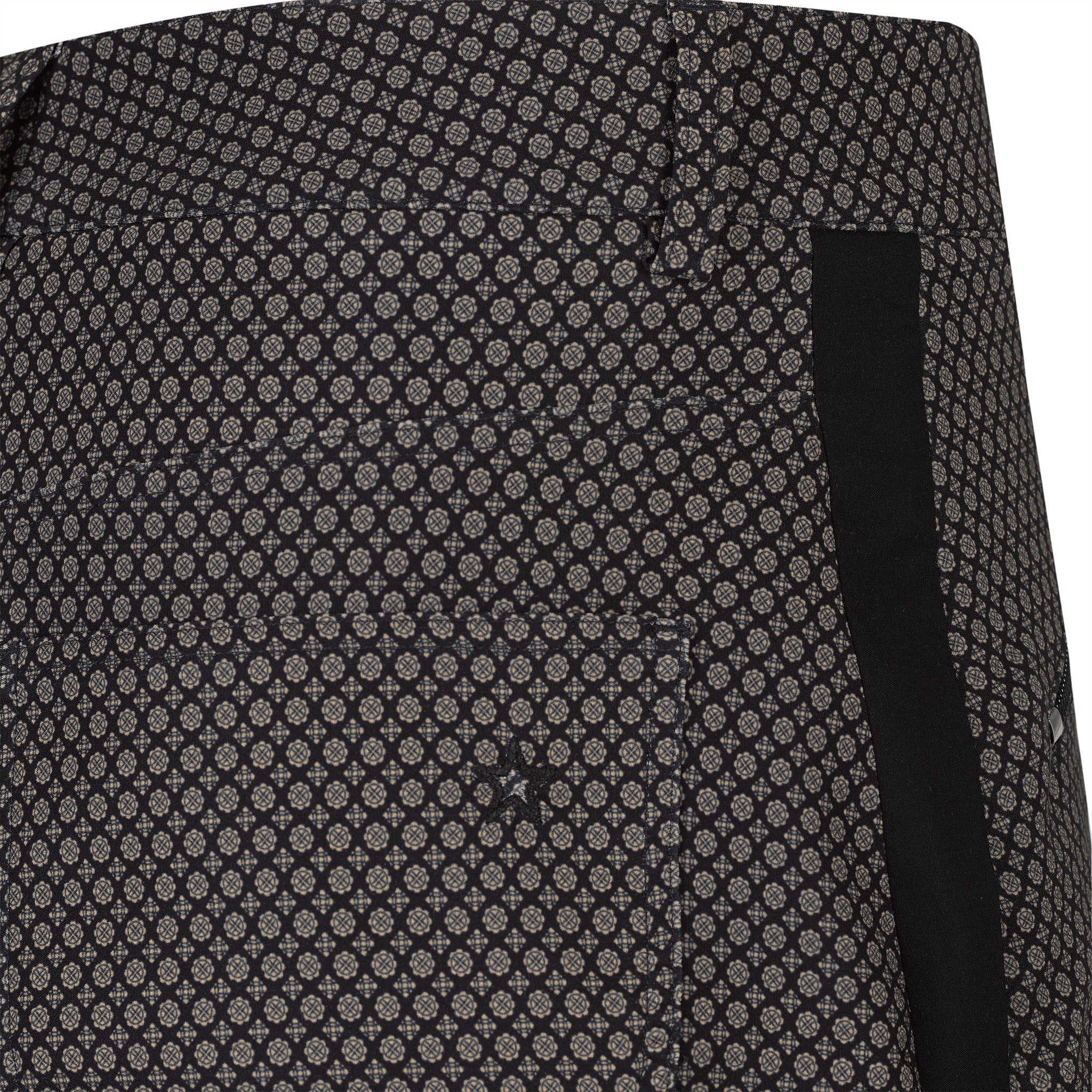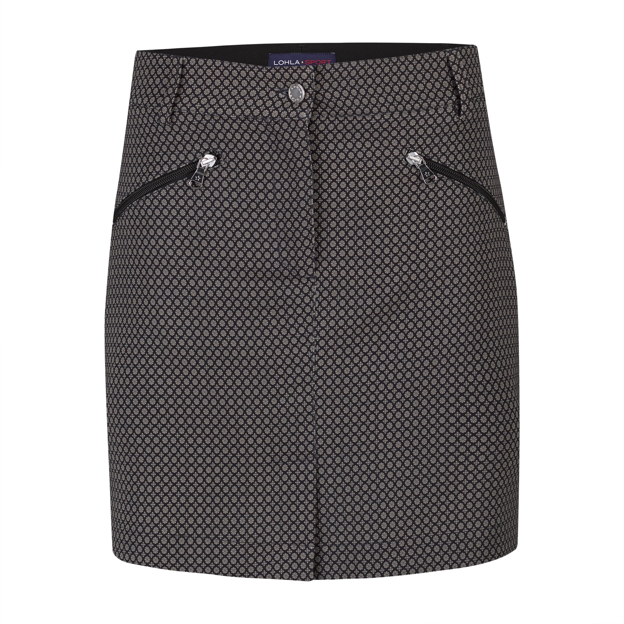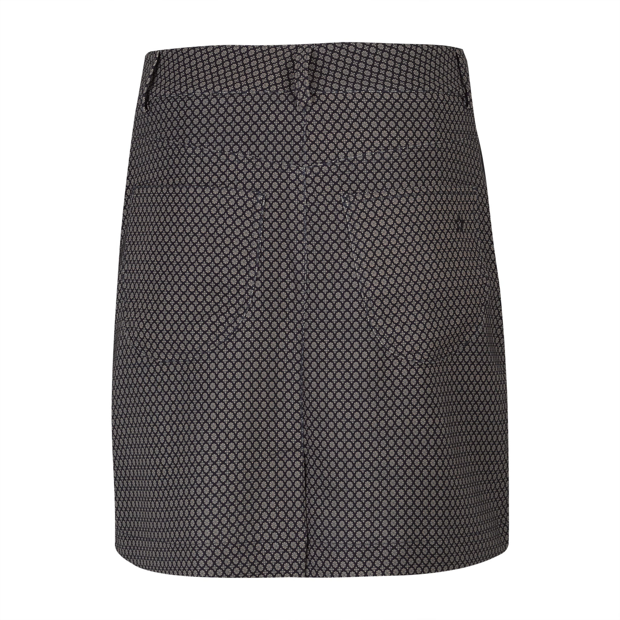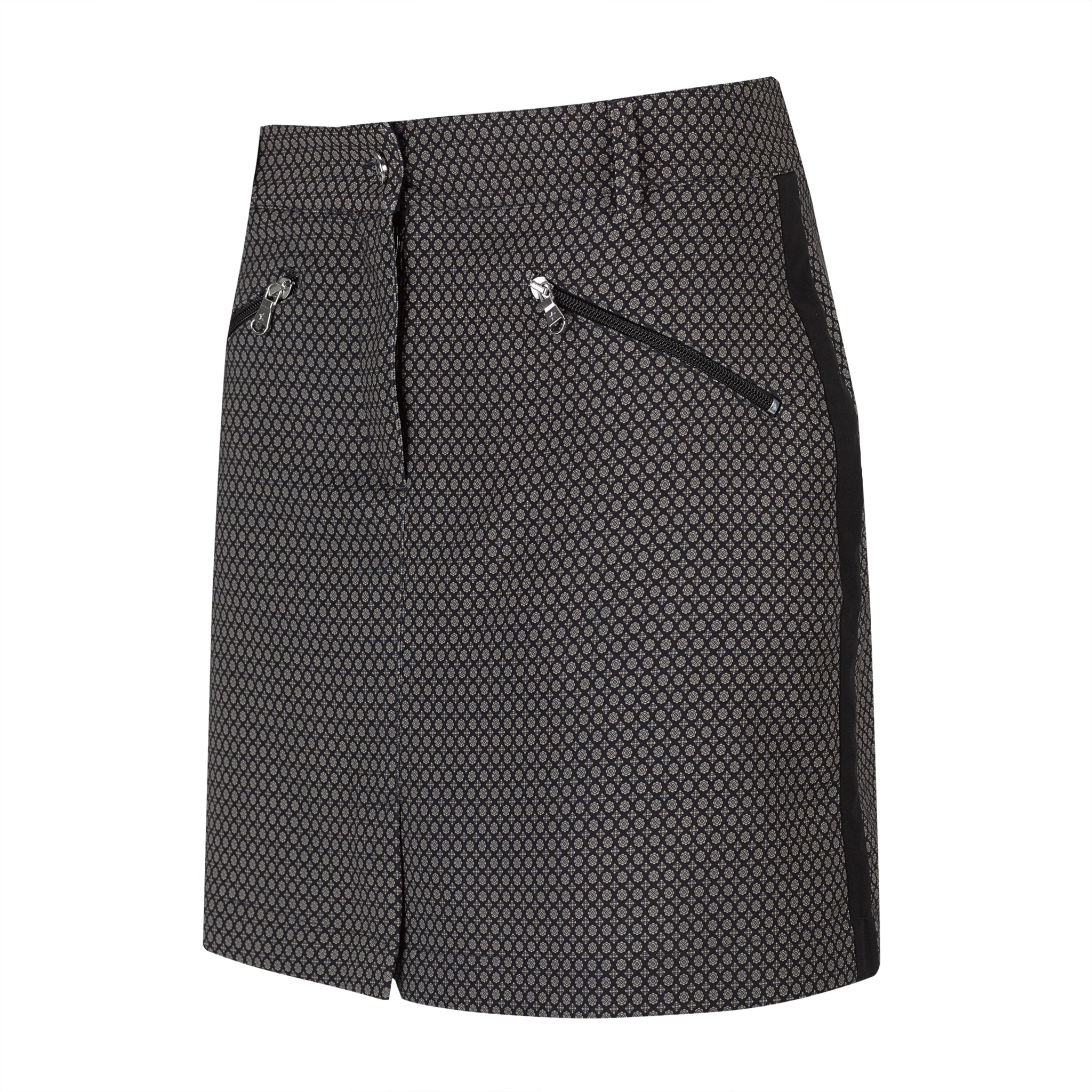 Black and khaki Alpine jacquard printed skort. 17" length. Black tuxedo stripe down side. Two front slant zip pockets. Two back patch pockets. Matches all tops in the Mont Blanc Collection. Wash in cold. Hang to dry.