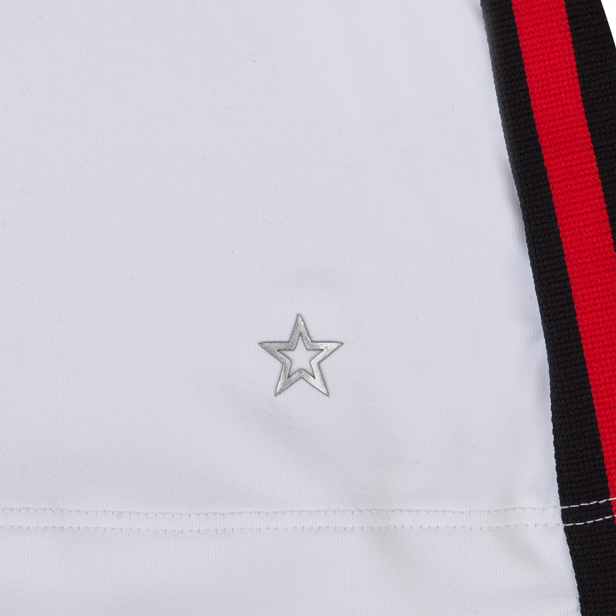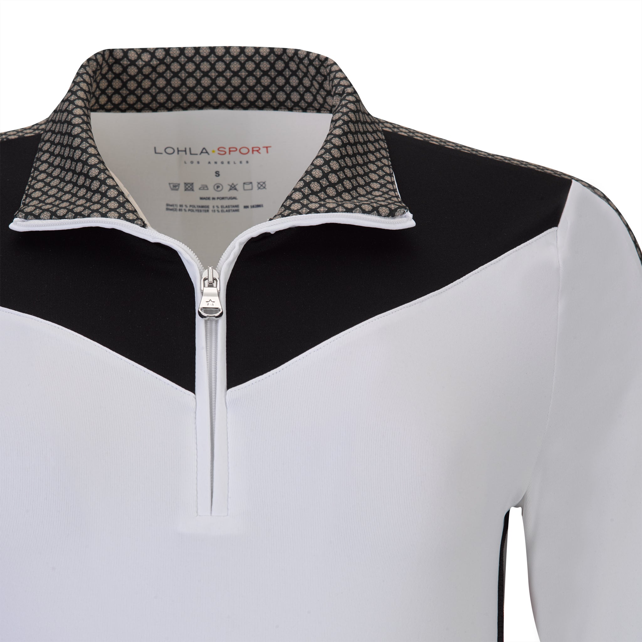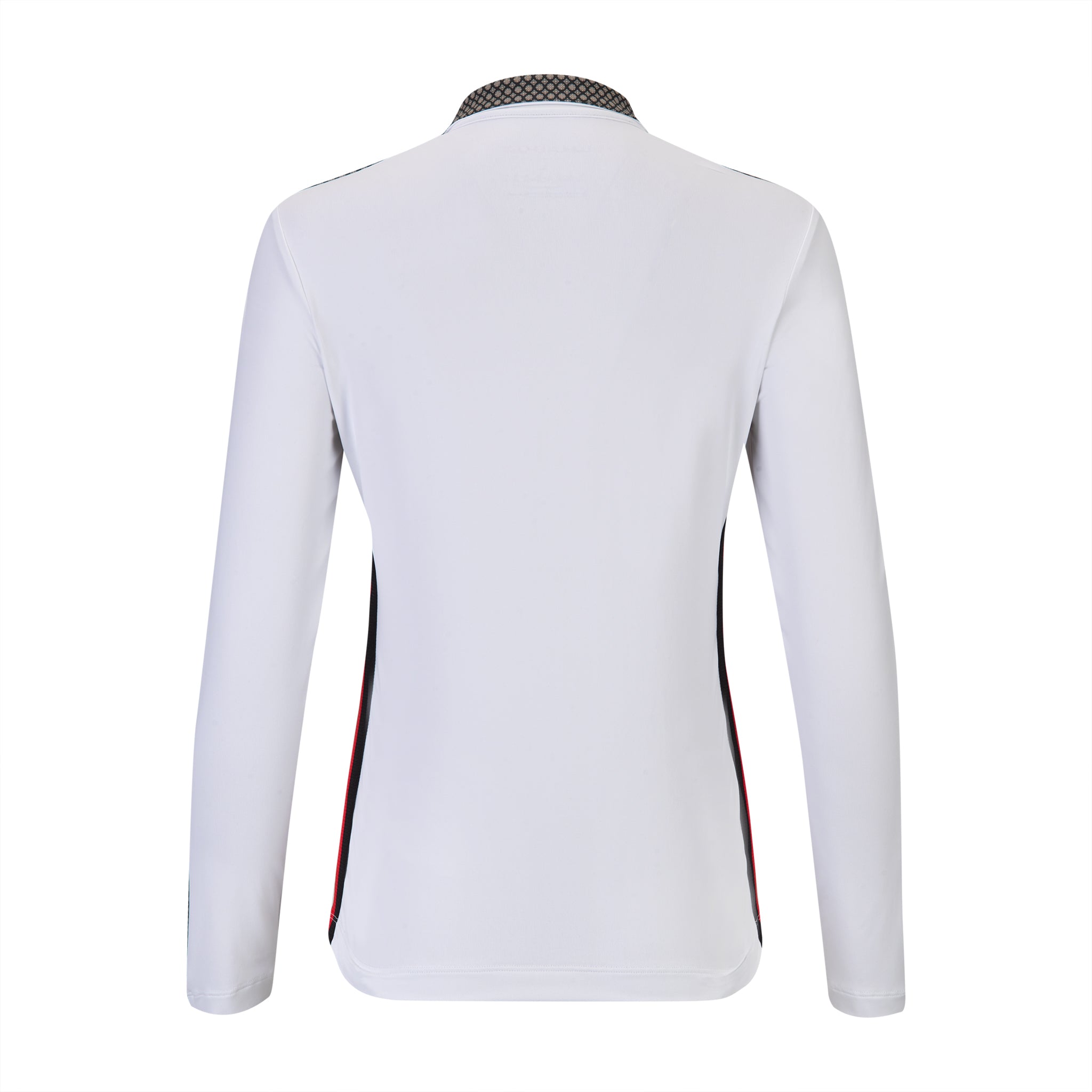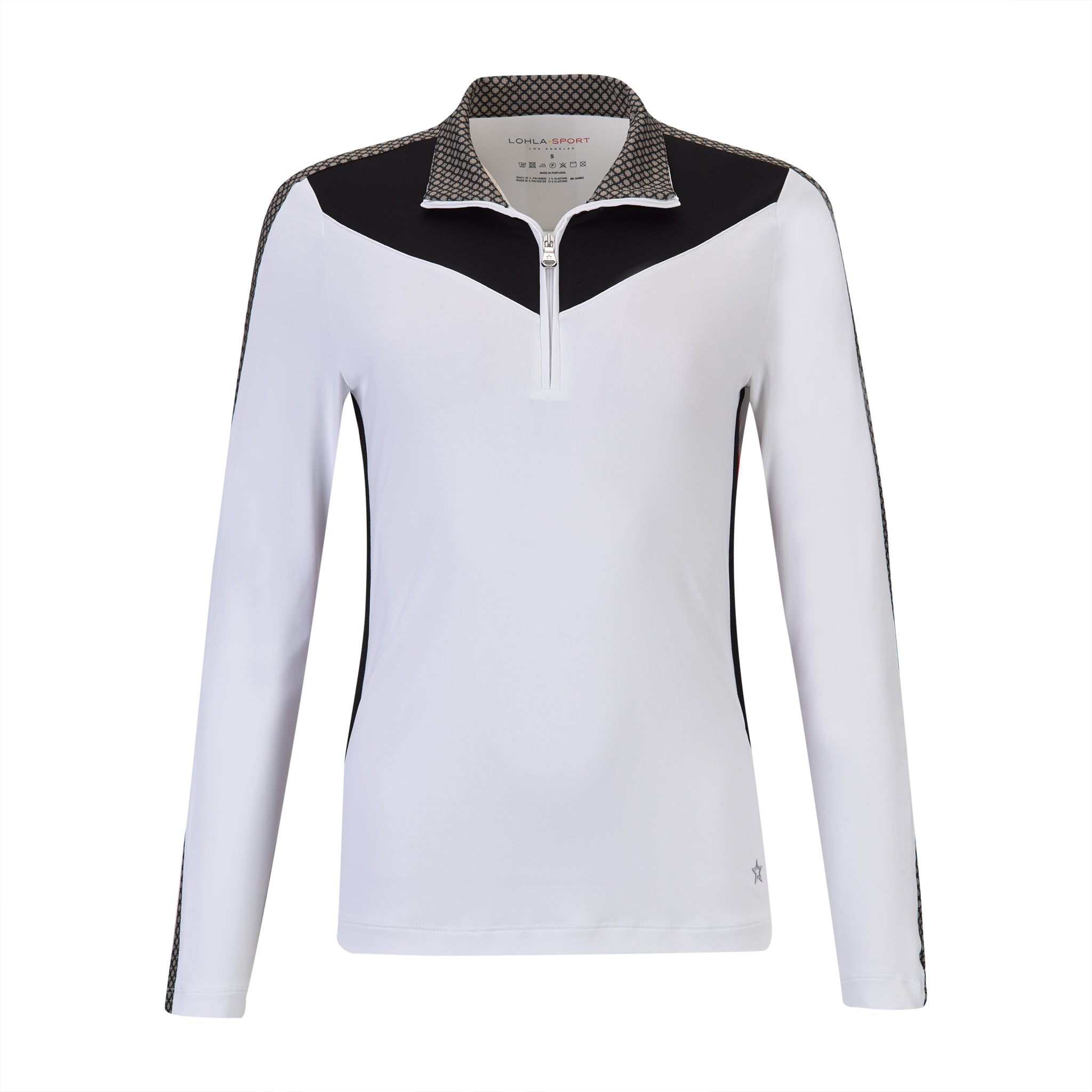 Long sleeve ski-inspired top. White body with black V panel at collarbone. Alpine print touches abound to match the Alpine Print Skort and Pant. Red and black sport stripe on inside of bodice. 95% PA, 5% EL.